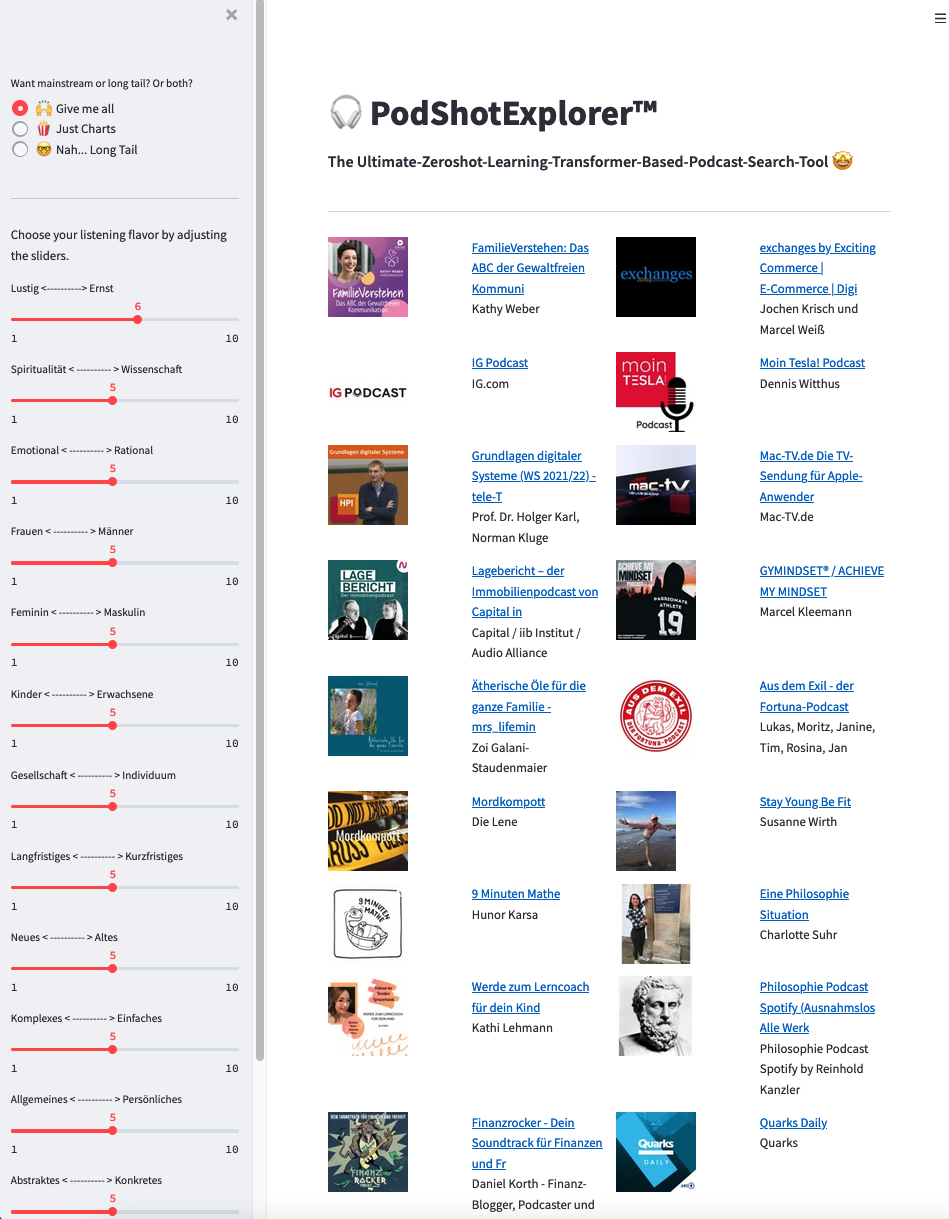 Die Bewertungen des Transformermodells hat Patrick Arnecke dann für seine Suchapplikation – dem PodShotExplorer – verwendet, die den ganzen Datensatz mit allen 7’600 Podcasts zugänglich macht. Die Applikation erlaubt es dem Nutzenden, diese kreativen Eigenschaften beliebig zu justieren und zu kombinieren, um bestmögliche Hörvorschläge zu erhalten.