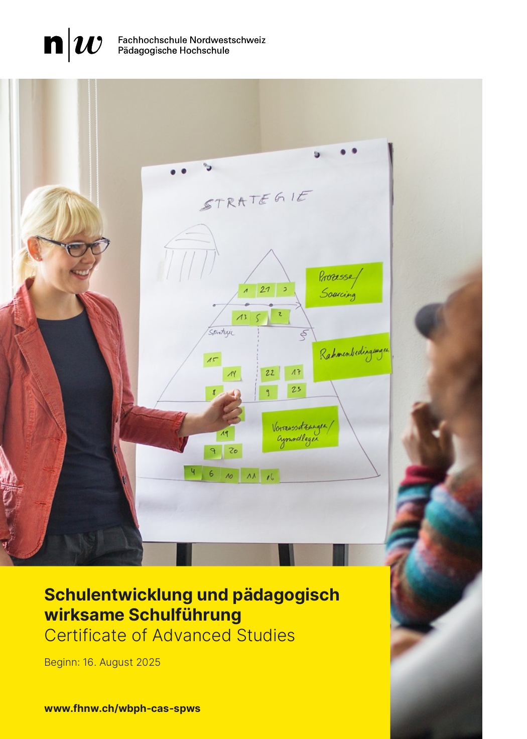 Certificate of Advanced Studies «Schulentwicklung und pädagogisch wirksame Schulführung» der Pädagogischen Hochschule FHNW, 15 ECTS-Punkte. Das CAS-Programm «Schulentwicklung und pädagogisch wirksame Schulführung» kann unter Anrechnung der geleisteteten ECTS-Punkte an das DAS-Programm «Schulleitung» (in Planung,) und das MAS-Programm «Change Management im Bildungsbereich» der Pädagogischen Hochschule FHNW erweitert werden.
