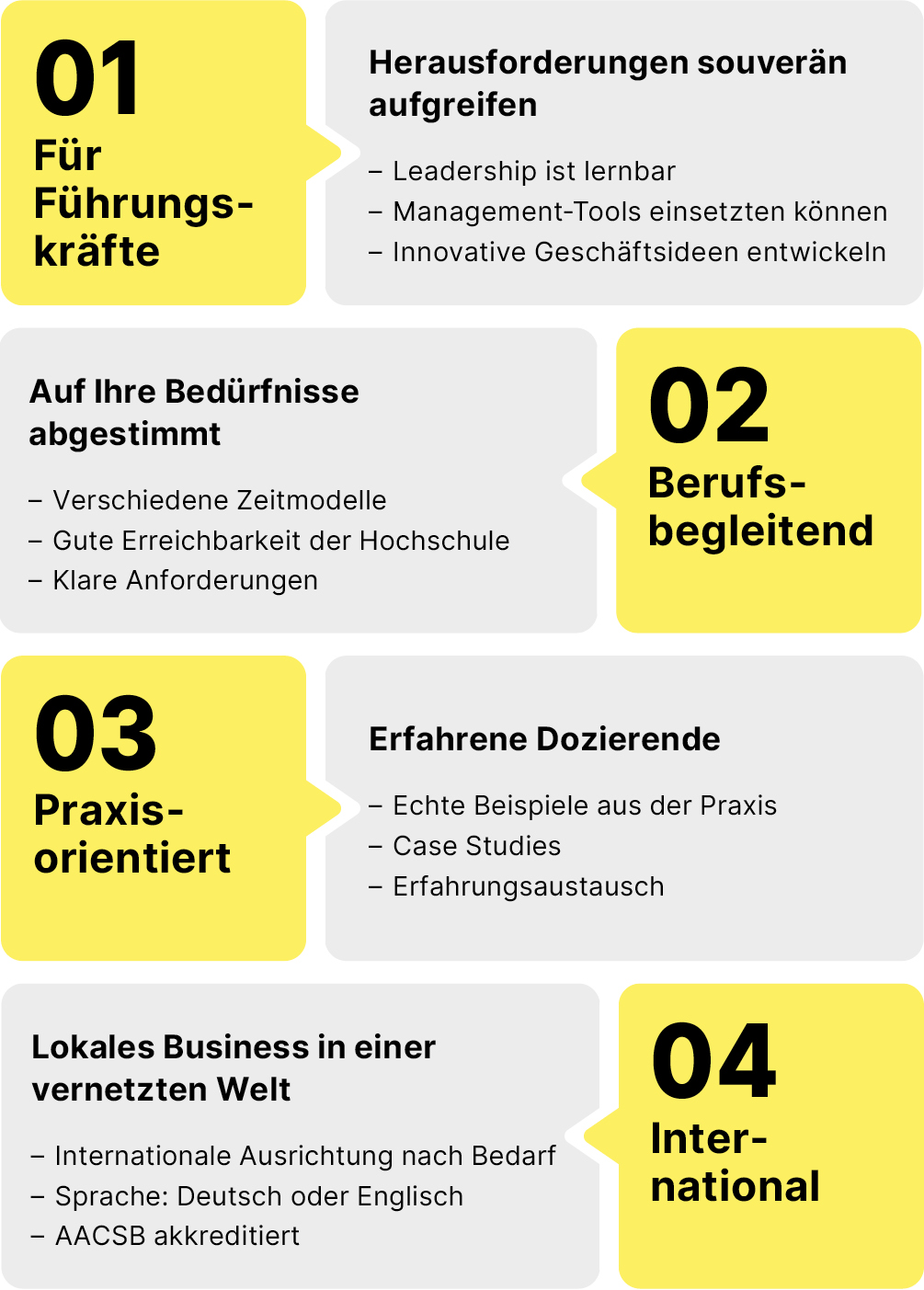 Die MBA Programme sind umfassende Management-Ausbildungen für Führungskräfte. Nicht-Ökonomen und Nicht-Ökonominnen – zum Beispiel Naturwissenschaftler/innen, Ingenieur/innen, Techniker/innen, Jurist/innen oder Firmengründer/innen - die Führungsaufgaben übernehmen, stehen vor zahlreichen neuen Herausforderungen: