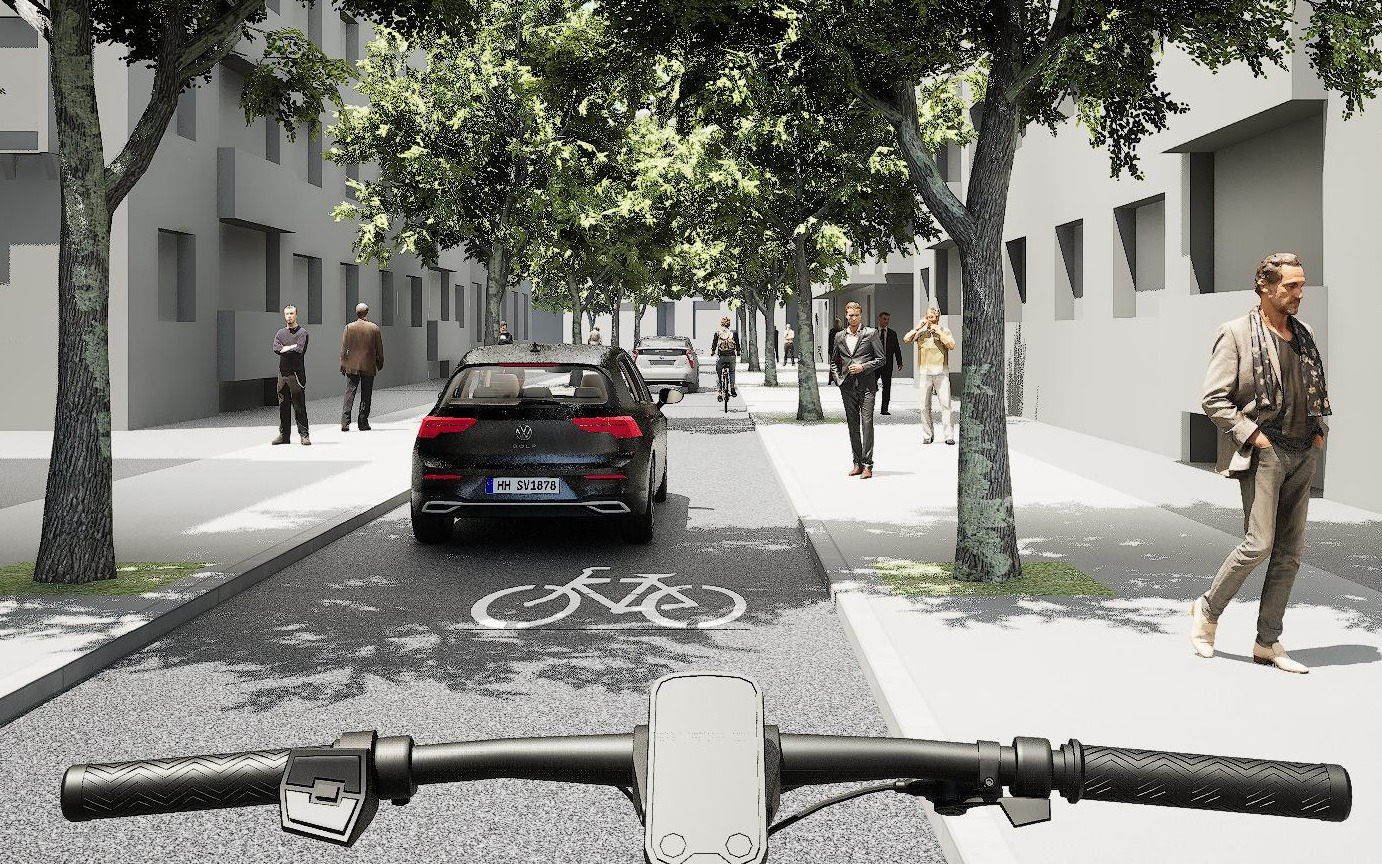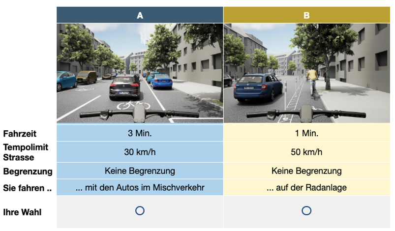 The survey consists of two parts: cyclists, e-bike riders and S-pedelec riders take part in an image-based stated preference route choice experiment as part of a web-based survey. The images are generated on the basis of an experimental design and visualised using ESRI City Engine and Unreal.