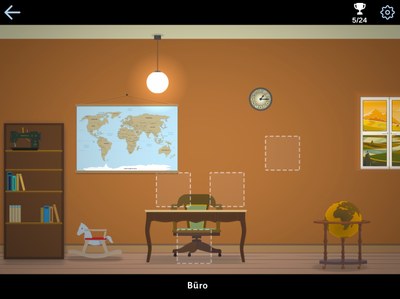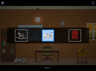 In Myosotis Souvenirs, different rooms of a newly renovated house must be furnished. The first step is to decide together which item to place in a certain location. Then the item has to be collected from the attic. Unfortunately, it is dark there and you need a torch to find the items. Here different interaction techniques for two players are used. One person holds the torch while the other opens a box or moves a curtain.