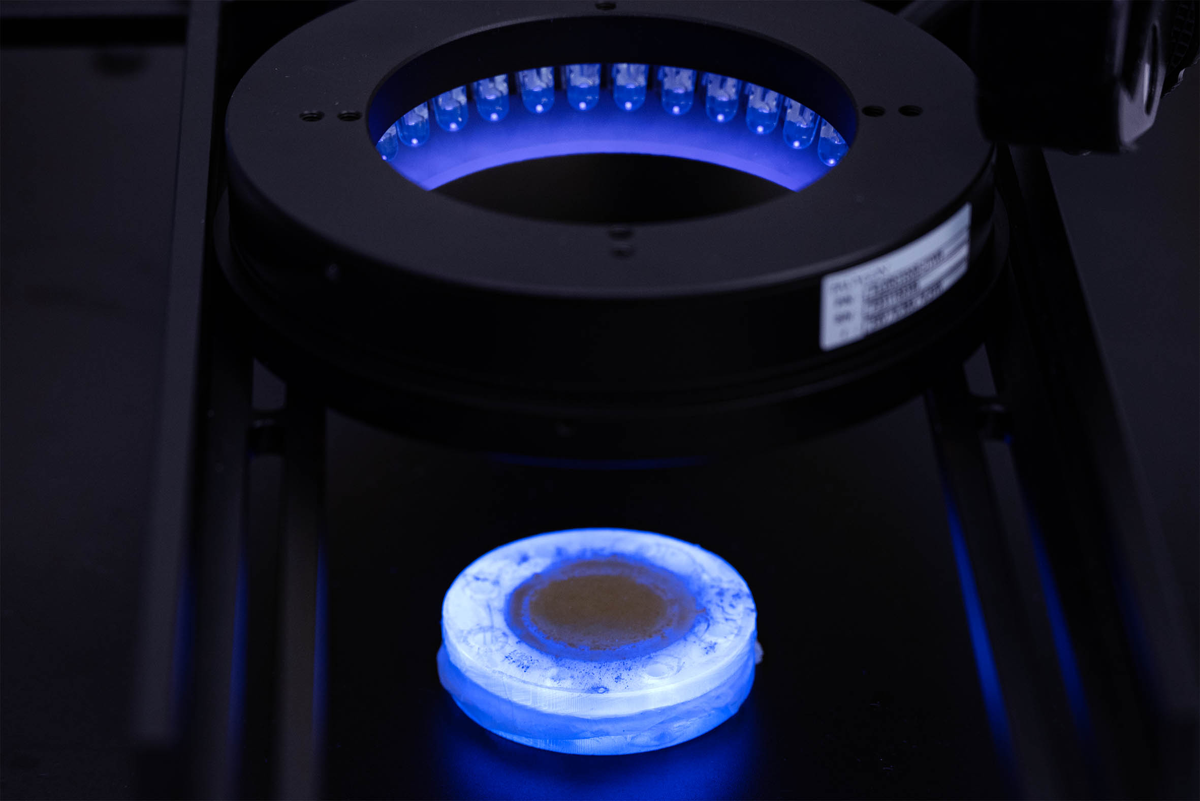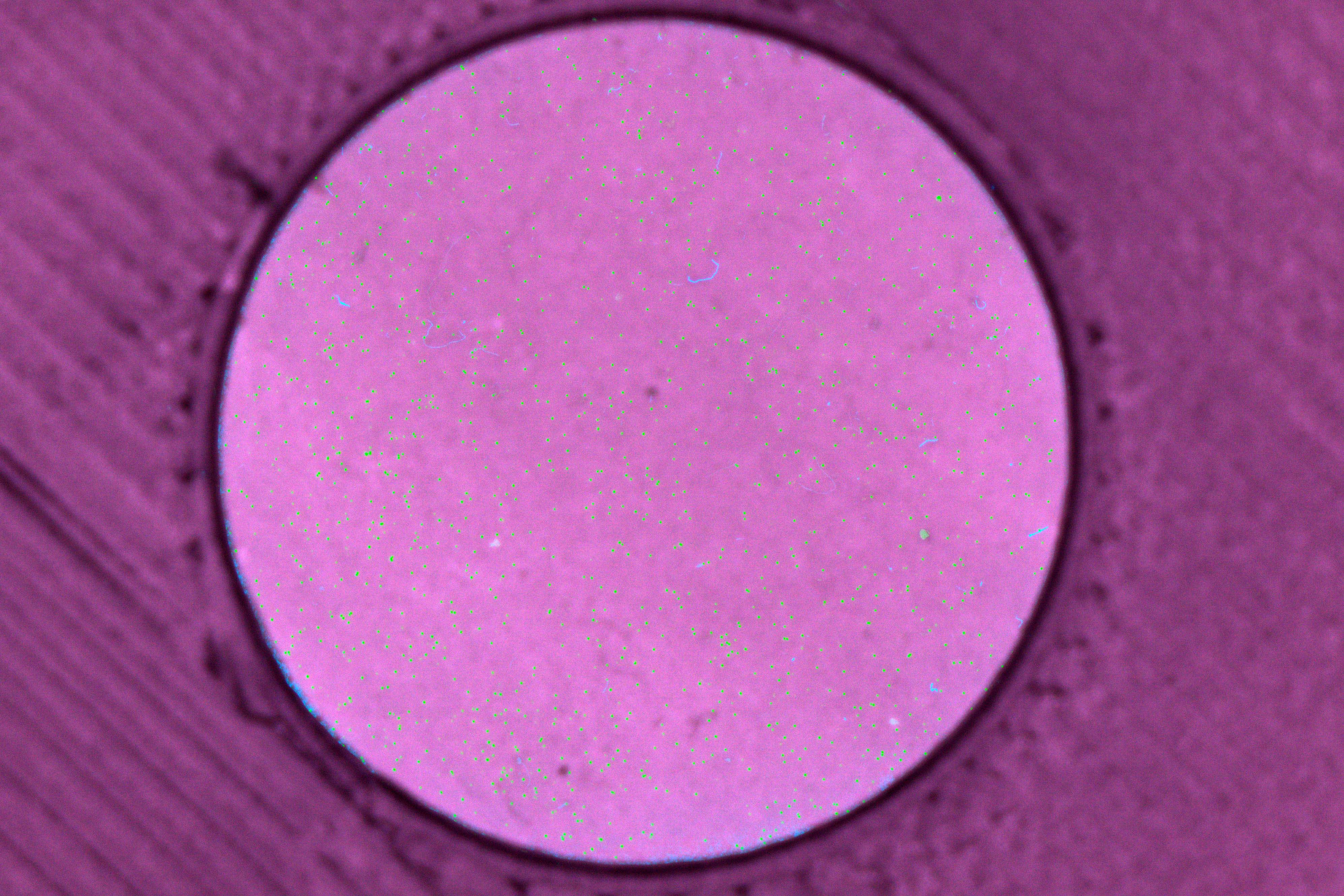 This newly developed system combines advanced optics with custom-built software. It offers an exceptionally high resolution of 8 x 8 micrometers across a wide field of view (42 x 37 millimeters) – a technical balancing act made possible by a telecentric lens (Myutron MGTL0345V) and a high-resolution camera (Basler ace 2 R). Illumination is provided by UV/vis technology (Falcon FLDR-i100B-UV24-W), enabling the visualization of fluorescent microplastic particles.