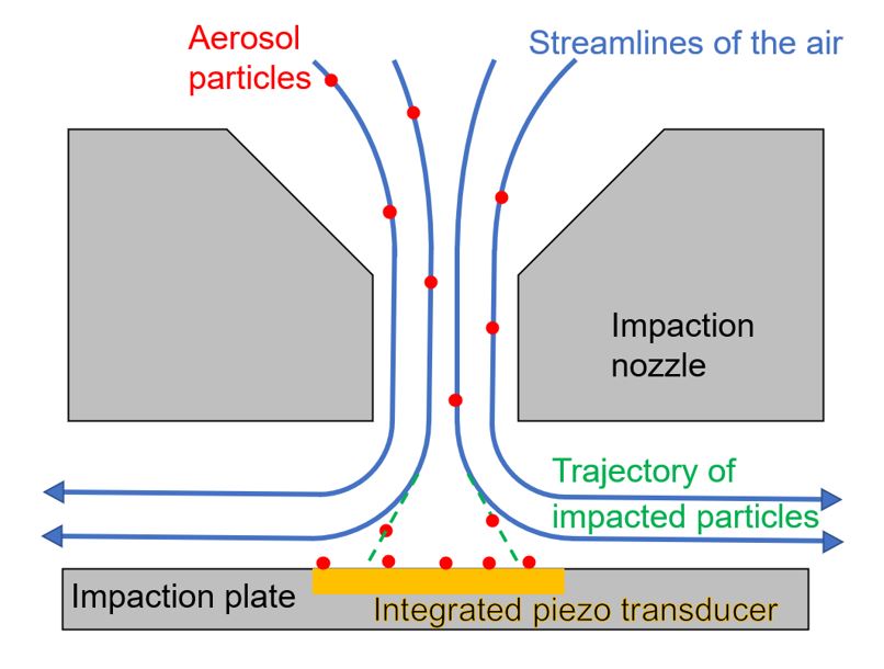 Our measurement principle uses a mechanical impactor setup with a nozzle that accelerates the particles before they impact. A piezo transducer is mounted on the impaction plate, which detects the momentum transfer of each impacted particle as a characteristic signal pulse whose amplitude is proportional to the particle mass.