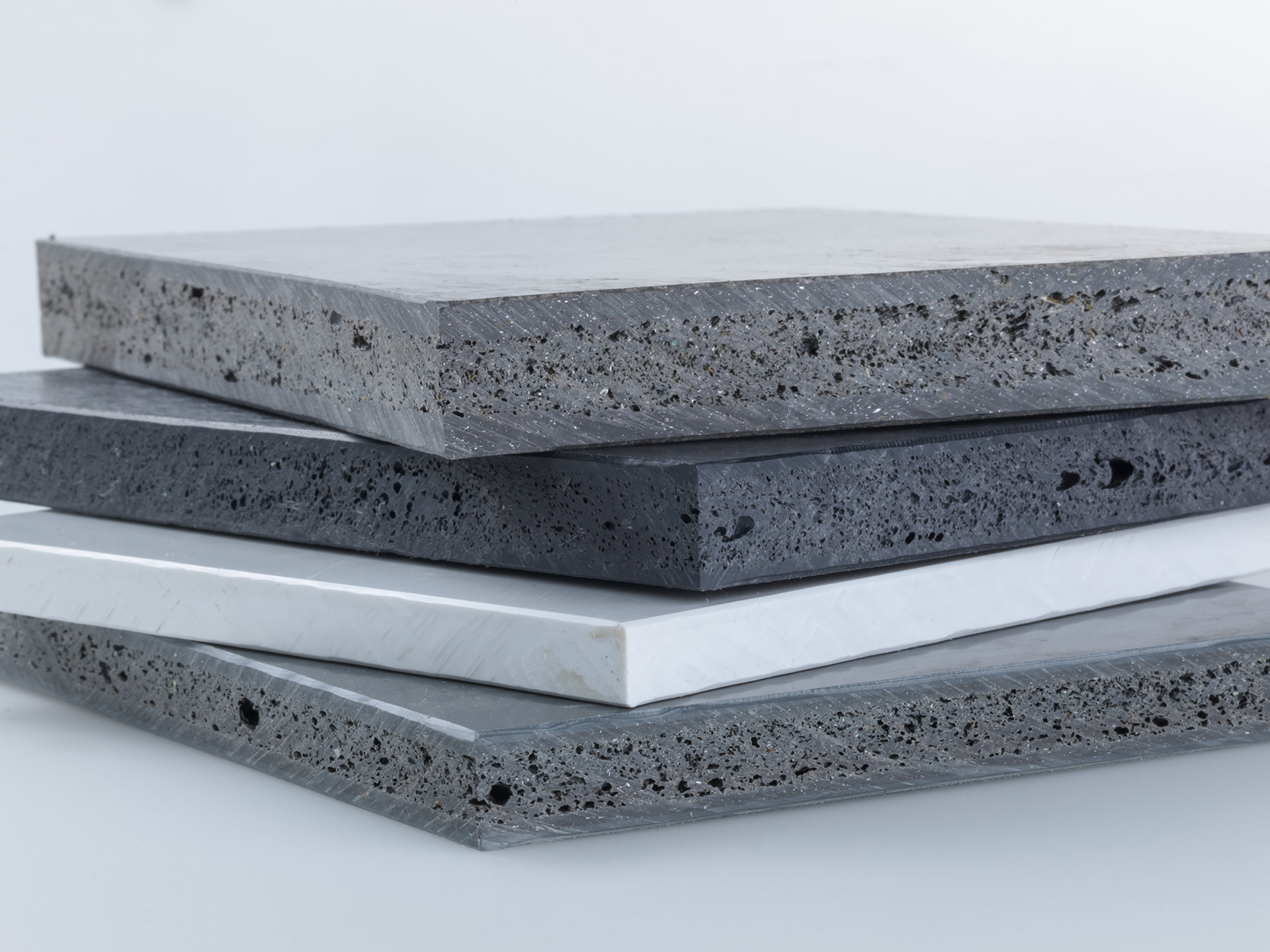 Four different sheet qualities were developed. Cover layers with reinforcing materials were extruded and mixed plastic was foamed in the core. The foaming of the mixed plastic proved to be particularly challenging, as the material contains impurities such as cardboard, paper, aluminium or wood. On the other hand, the mixed plastic is supplied in the form of small pieces of film, which makes gas absorption more difficult.