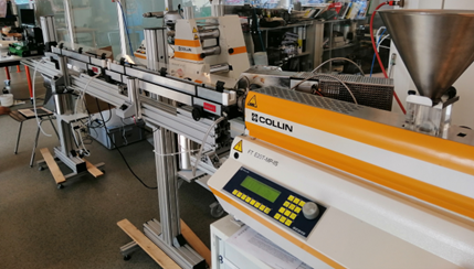 An extended market research was carried out with the specifications drawn up. Based on the desired properties, three biopolymers from two companies stood out. Material tests and extrusion trials on the laboratory extruder at the Institute of Polymer Engineering were able to evaluate the sampled materials as suitable for large-scale trials.