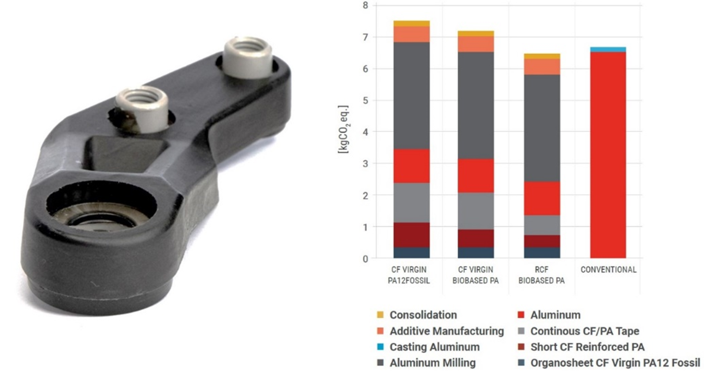 Our project investigates the development of short fibre-reinforced 3D printing filament with various reclaimed carbon fibre content, as well as the development of a continuous tape filament with reclaimed carbon fibre. Combined with reclaimed carbon fibre, short and high-oriented composite materials were developed, characterized and used in the three end user applications.