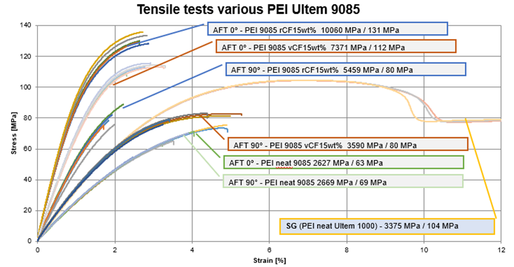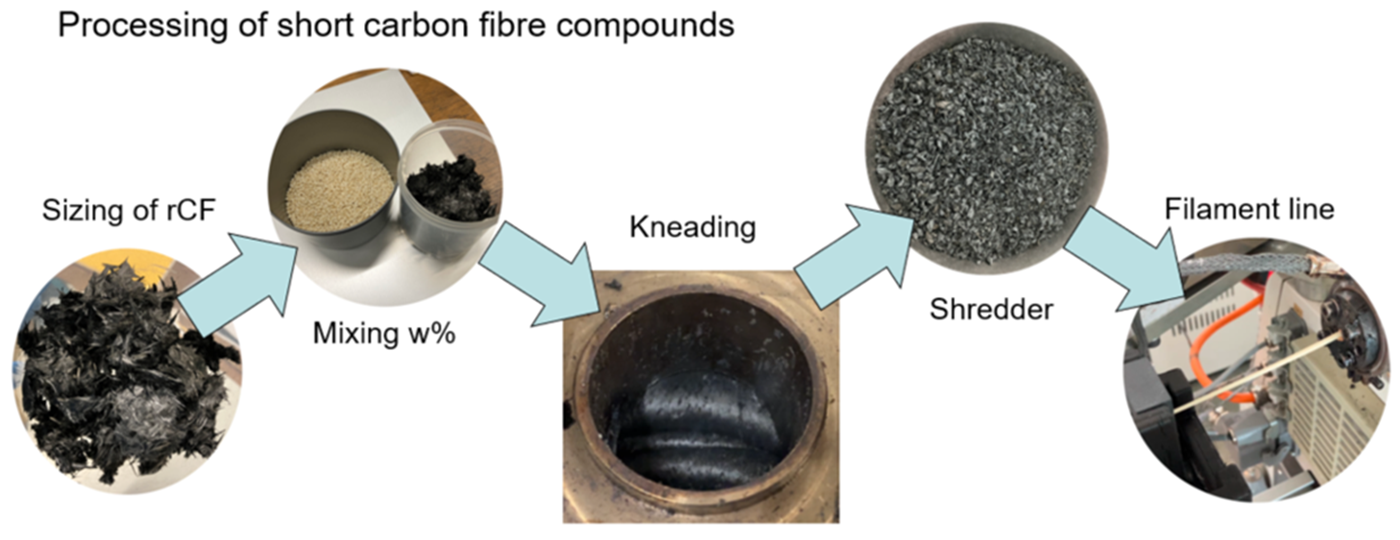 Quasi-static tensile tests demonstrated that an increase in fibre content leads to an increase in tensile strength and stiffness. The 3D printing process helps the realignment of short fibres, resulting in a 10% increase in tensile strength. The recycled carbon fibres showed the same properties as their virgin counterparts. Compounds with 35w% carbon fibre were possible.