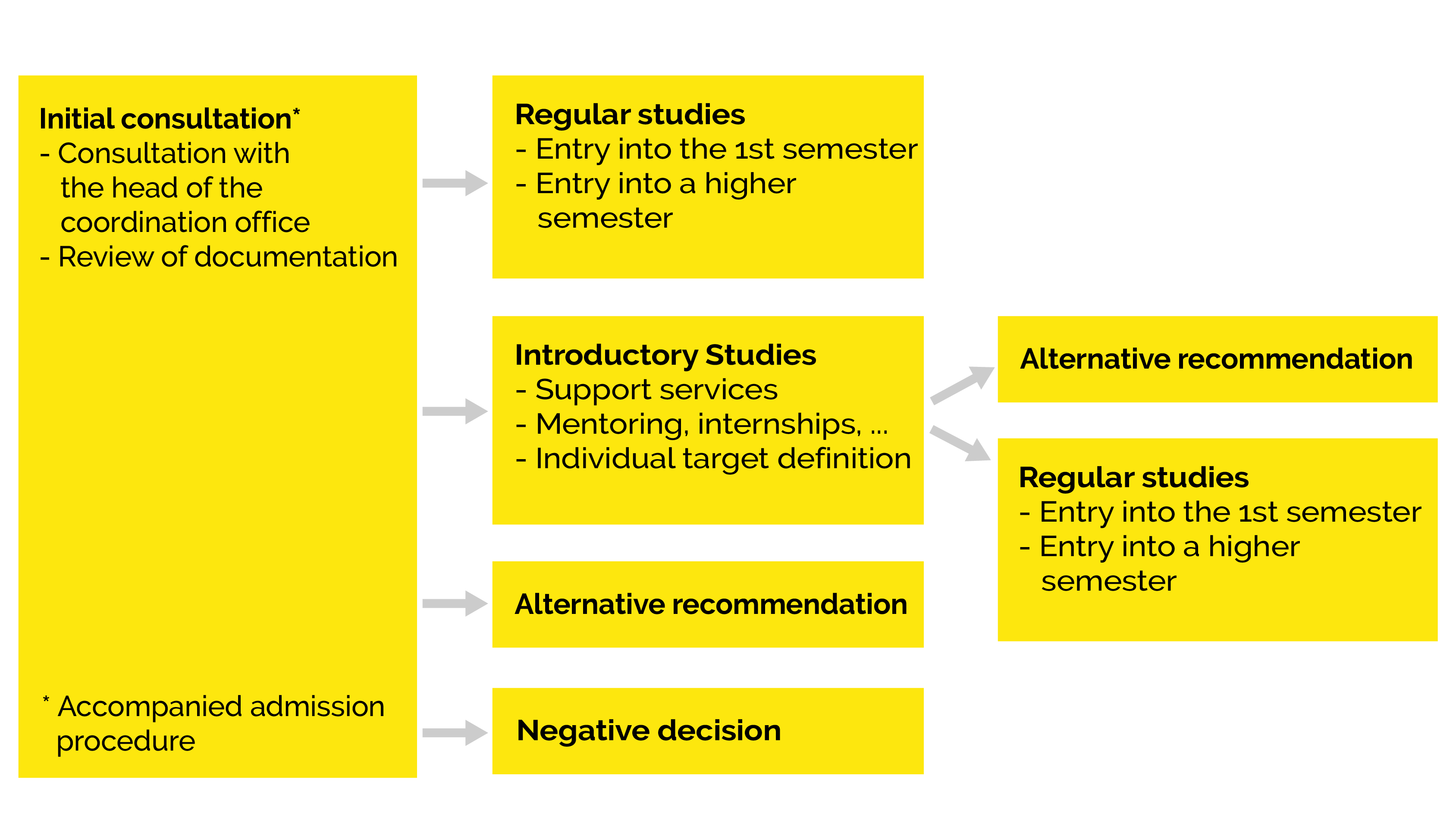 There are different admission criteria for regular admission and admission to the introductory programme. The basis for both is proof of appropriate previous education and language skills in German. If the proof of previous education cannot be provided with documents (diplomas, etc.), it is possible to individually clarify whether a qualification exists.