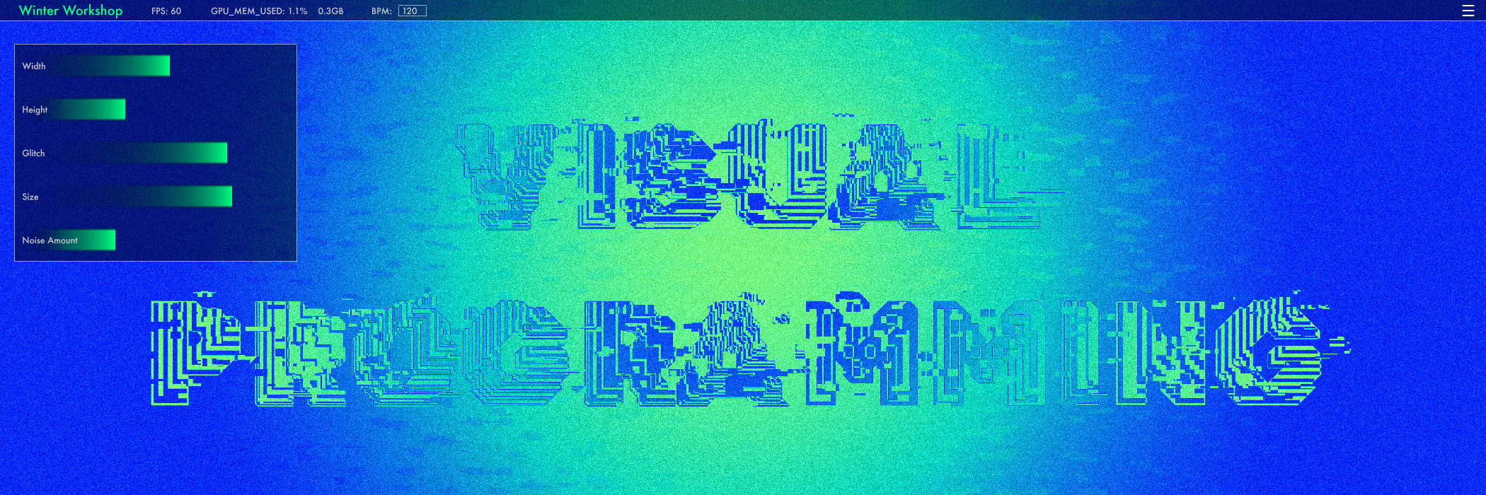 This course focuses on three central areas: creating audio-reactive visuals, controlling interfaces with input devices, and building custom user interfaces inside TouchDesigner. You will apply iterative methods and hands-on experimentation to develop your own audiovisual project with a custom interface.
