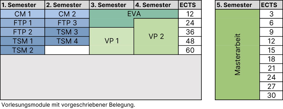 In contrast to the content-defined foundational studies, the Master's program aims to allow for a flexible structure tailored to individual preferences. The goal is to create a study plan customized to your personal preferences. The framework of the study structure is visualized in the following graphic.