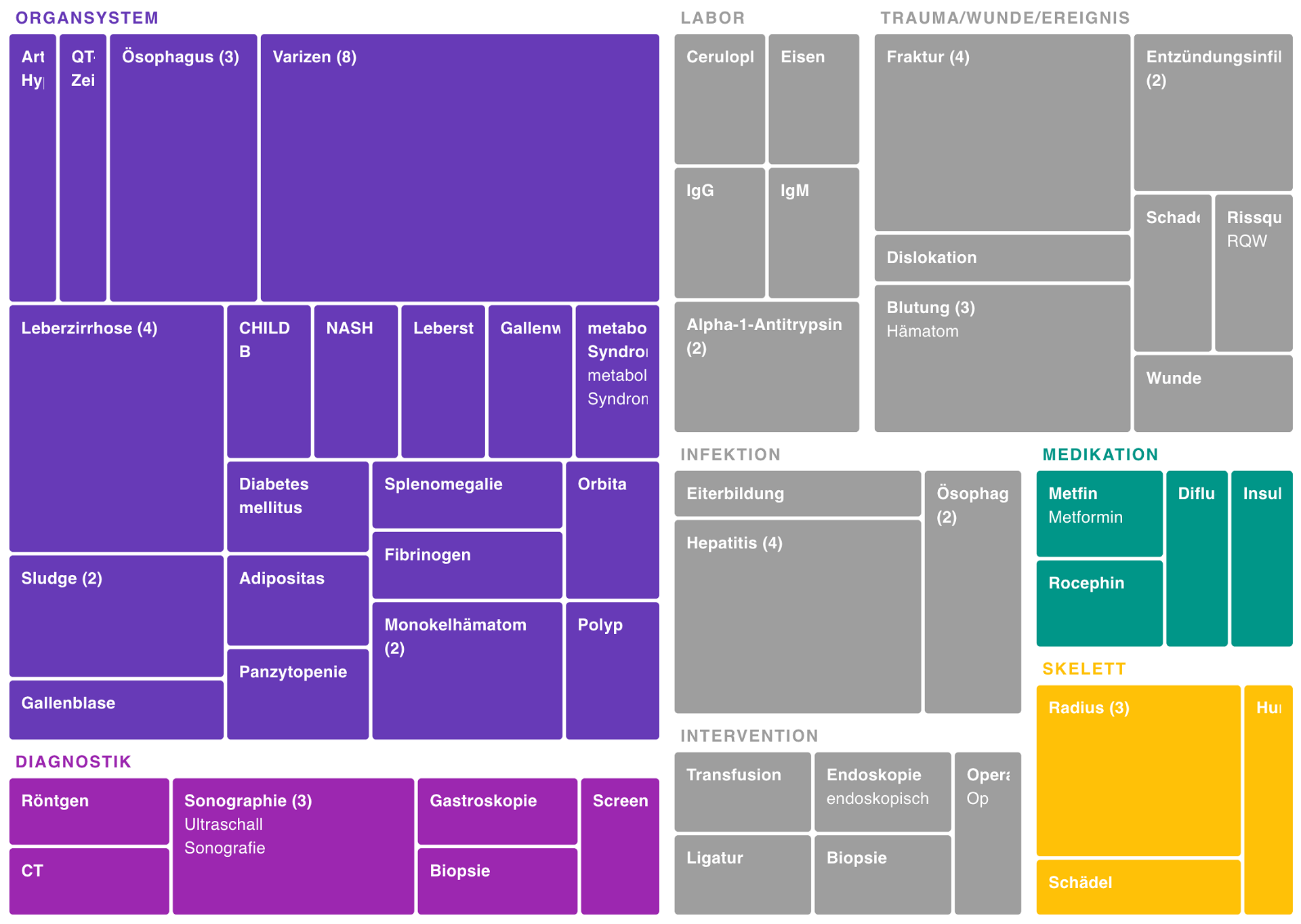 A diagnosis list allows experienced colleagues to quickly get a picture of the patient's documented condition, although the grasp of the complexity and any correlations within the list depend on the knowledge and specific skills of the practitioner. Recognition of patterns or correlations between diagnoses and other data (such as findings, examinations, therapies, etc.) is difficult and very time-consuming due to the abundance of information.